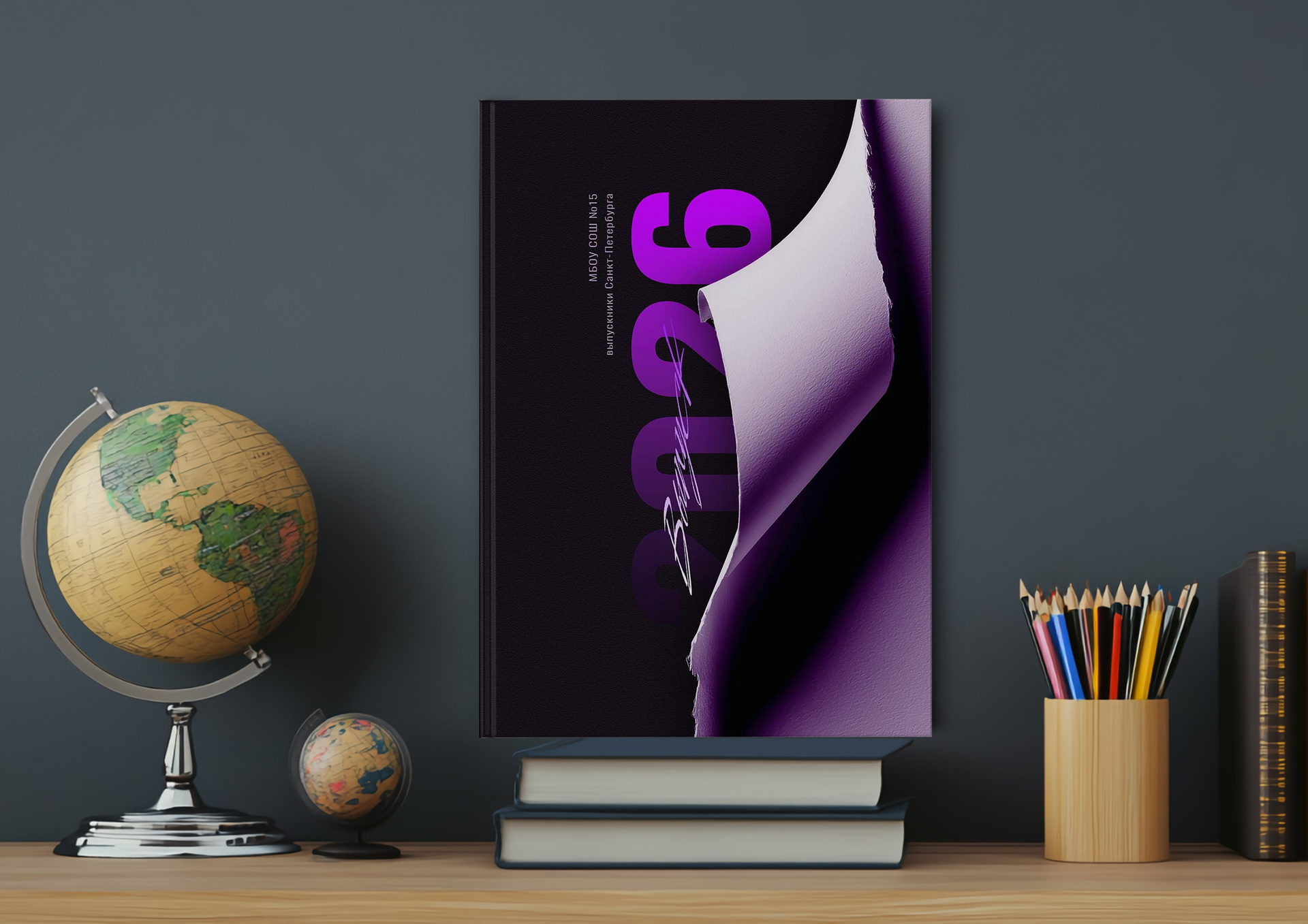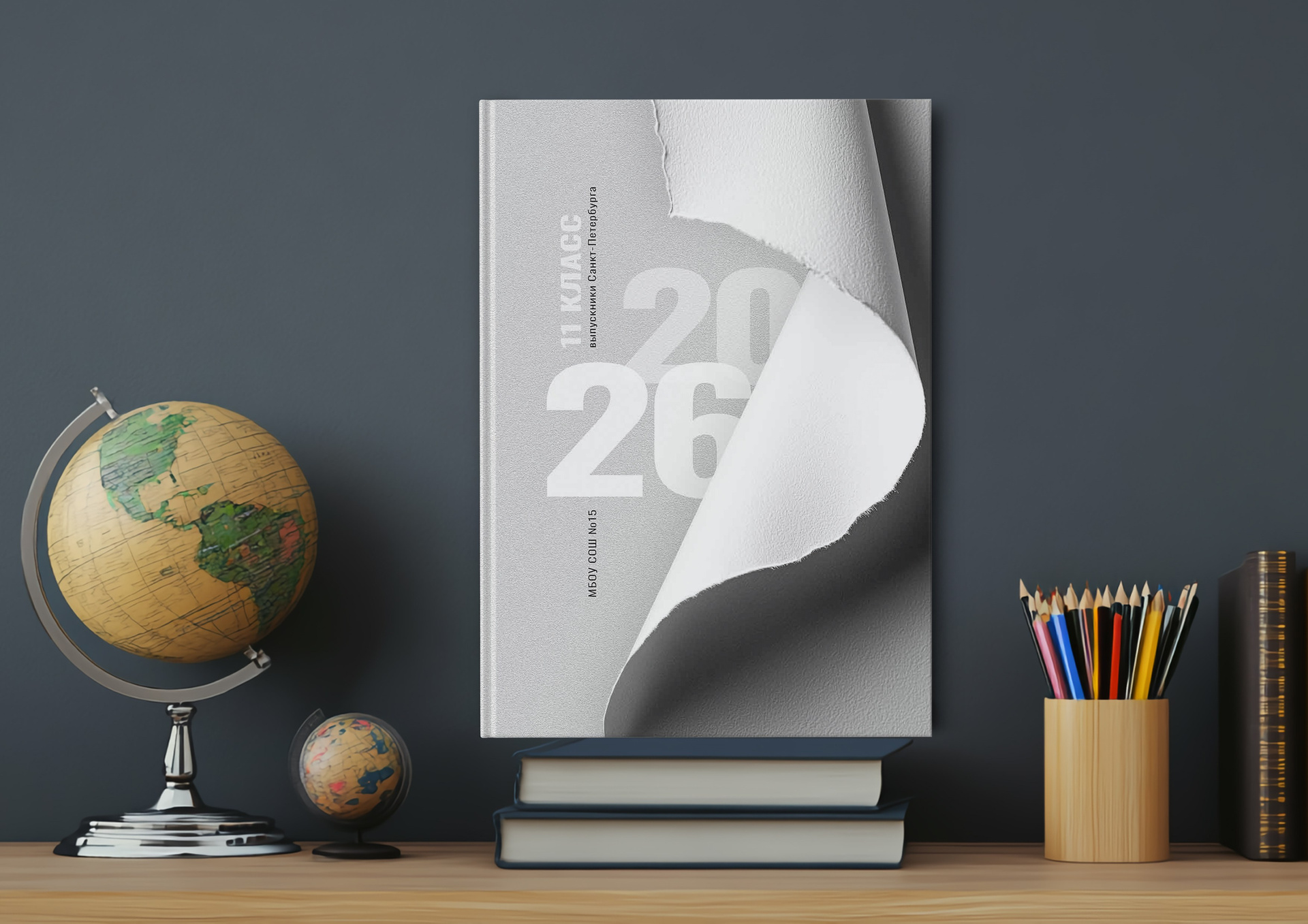 Два варианта обложки — графическая или с персональным портретом старшеклассника. Использовать можно на любое количество разворотов.